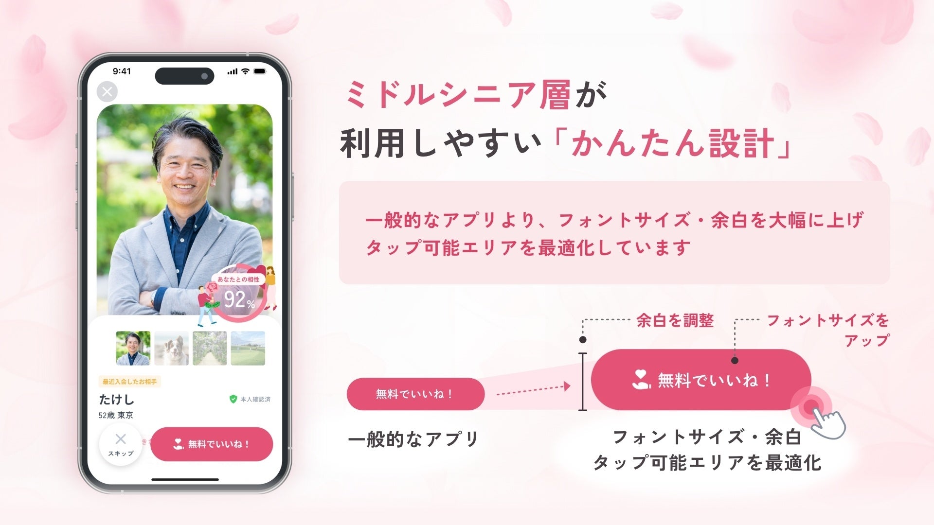 「プロフィール文の作成が難しい」「写真撮影が上手くいかない」「マッチング後に何をすればよいかわからない」など、マッチングアプリの登録から利用時におけるミドルシニア層特有の使いづらさを解消することで、新しい恋のはじまりをサポートします。