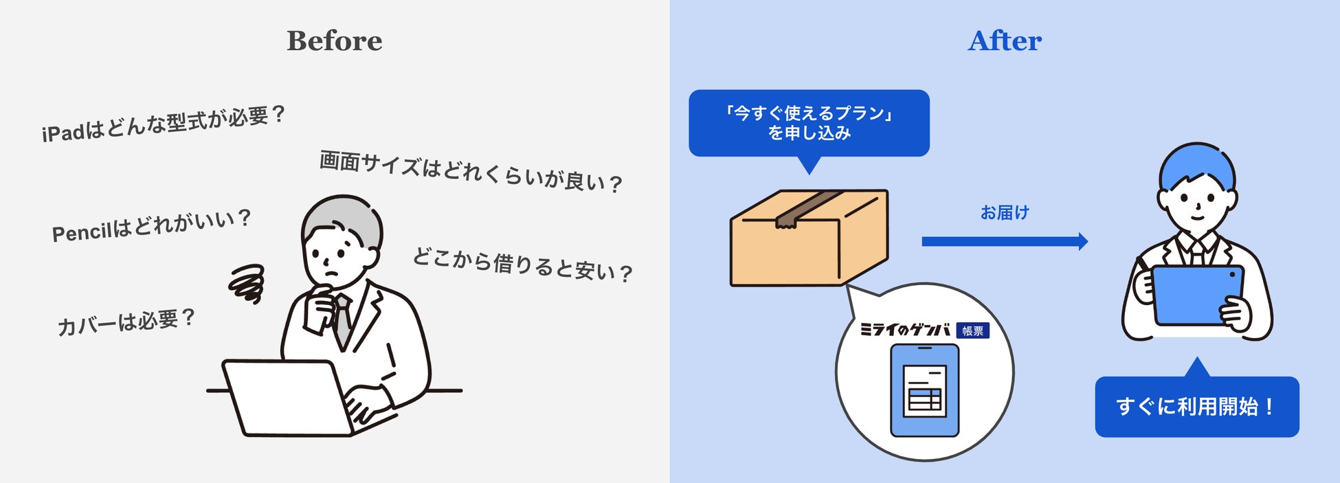 一方、ミライのゲンバ帳票を利用するためには、iPadをご利用企業側にて準備いただく必要がありました。その際、企業側でどのようなiPadやペンシルを用意したらいいか苦慮されるといった課題がありました。